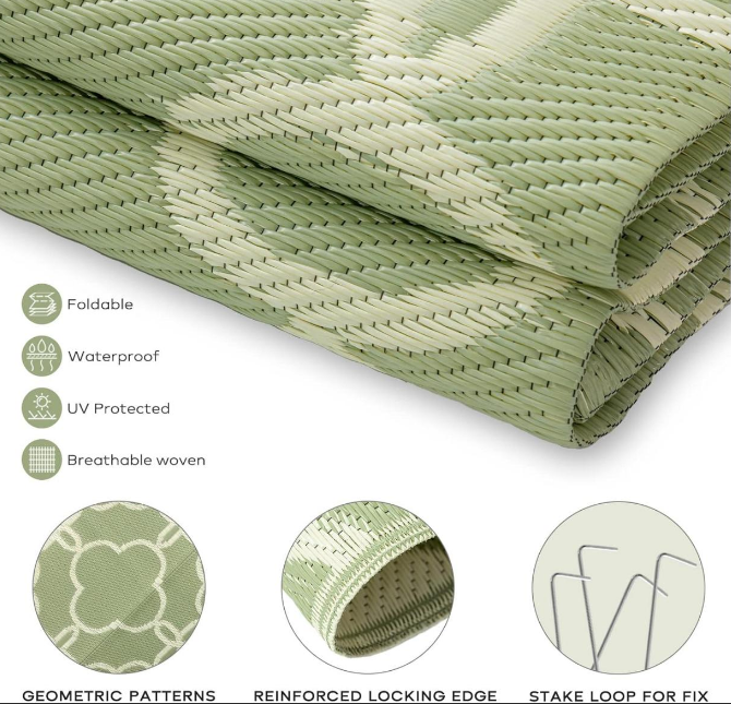 Ein weiterer wichtiger Vorteil ist die einfache Wartung. Diese Matten sind so konzipiert, dass sie leicht zu reinigen sind: Einfach mit Wasser abspülen und an der Luft trocknen, um Sand, Schmutz oder verschüttete Flüssigkeiten in Sekundenschnelle abzuwischen. Polypropylen-Terrassen-Außenteppich und Campingteppich Nutzen Sie das strapazierfähige PP-Material, das Flecken und Feuchtigkeit widersteht, ohne die Form zu verlieren. Strohmatten aus recyceltem Kunststoff bieten einen umweltfreundlichen Mehrwert: Sie sind atmungsaktiv und grassicher, schaden dem Rasen nicht und sind gleichzeitig feuchtigkeitsbeständig und schimmelhemmend.