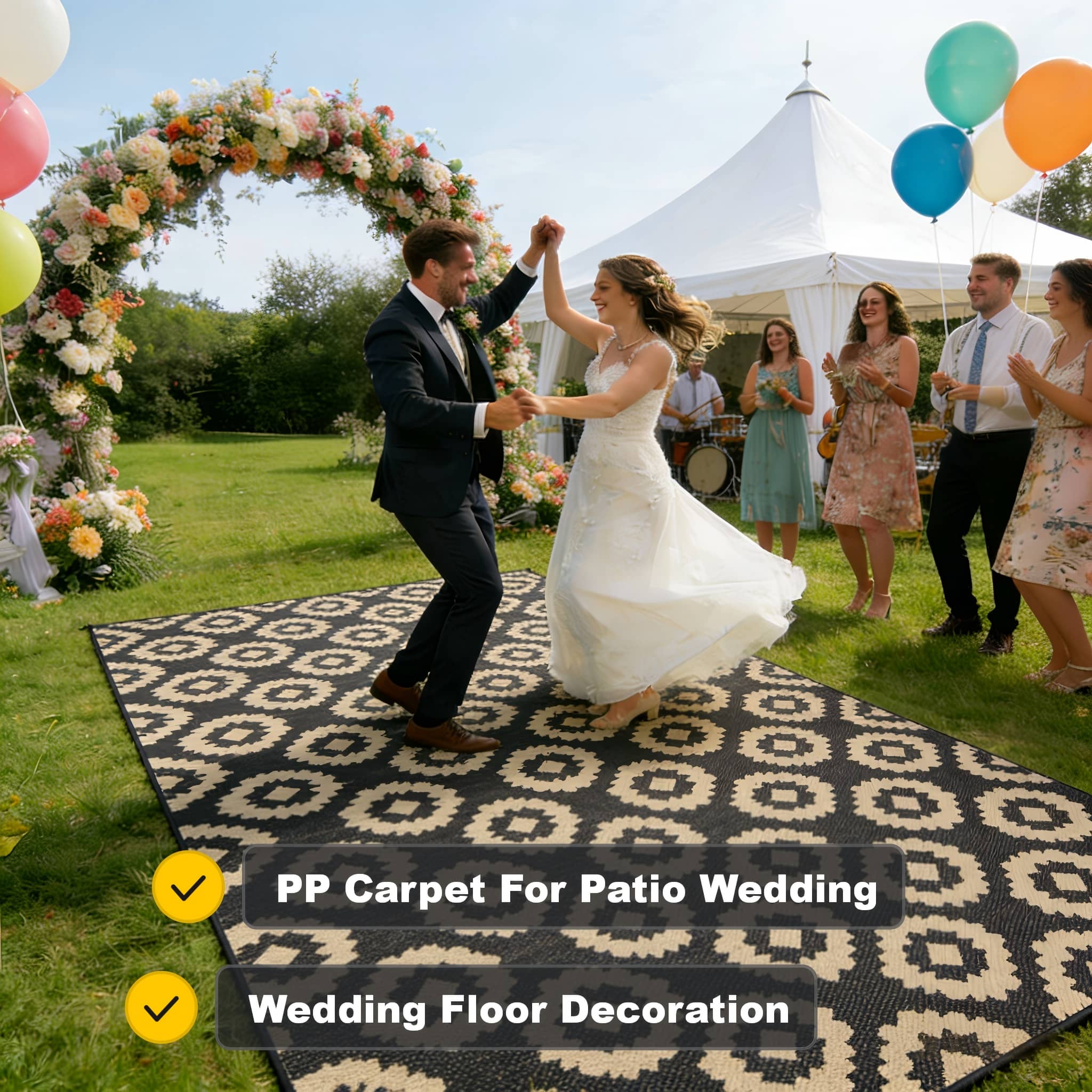 PP-Außenteppiche (Polypropylen) zeichnen sich durch wasserdichte, feuchtigkeitsbeständige und wetterbeständige Eigenschaften aus, die den Anforderungen der Außenanwendung gerecht werden. Die meisten meistverkauften Modelle sind in hellen oder neutralen, schmutzabweisenden Farben erhältlich und verfügen über praktische und langlebige Funktionsmerkmale. Einige sind für bestimmte Szenarien wie Hochzeiten und Camping konzipiert.